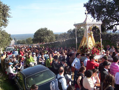 Extraordinaria la afluencia de gente a la ermita. Por fín, han quitado la pintura azul rabioso de las molduras, han cambiado el suelo por otra baldosa hidráulica y han hecho mejoras en el patio. Los escudos de los dos pueblos, como la Virgen (tan jarota y tan taruga)a las puertas de la ermita. Lo que sobra, para mi gusto, es tanta mercadería y tanta discoteca. Imagino cómo sería la romería sin esos puestos de tanta m... que lo inundan todo. Los ayuntamientos deberían ayudar a mantener las romerías sin que las hermandades tengan que "vender" espacio para luego poder pagar la recogida de la basura que deja la gente por los suelos. ¿No podría hacerse una campaña de concienciación para que la gente se lleve lo que ha traído? Por ejemplo, con bolsas repartidas entre los corrillos para que recojan sus latas, sus bolsas de plástico, etc. etc., o con una buena campaña de concienciación sobre la sucia desolación que invade, al día siguiente, ese paisaje maravilloso de La Jara. También habría que limitar el horario de la música atronadora de la discoteca, vacía, a lo largo de la mañana. Algo hay que hacer.